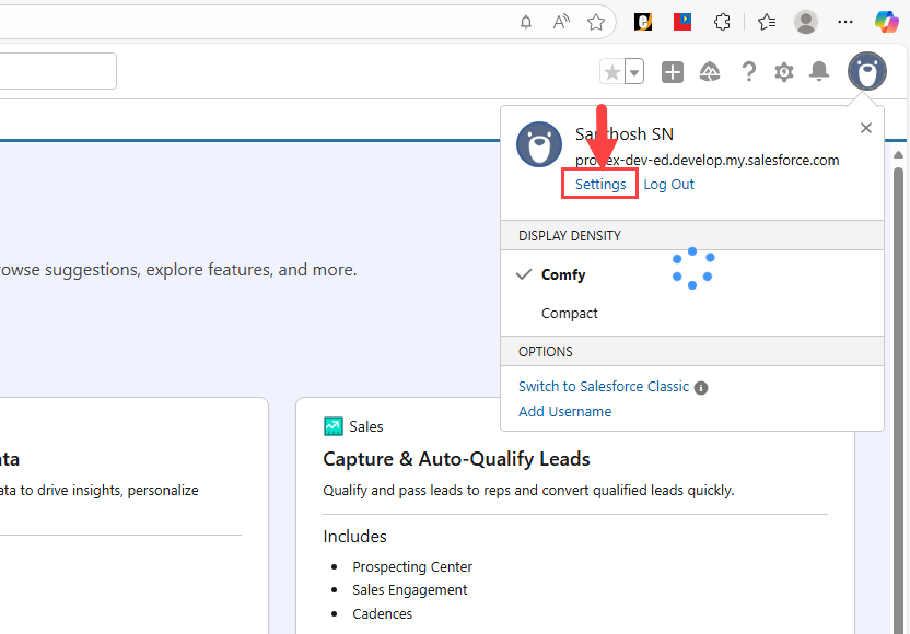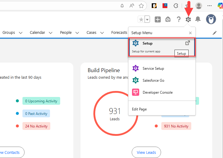 Once you log in to Salesforce, click the icon in the top-right corner of the screen, then select Setup.