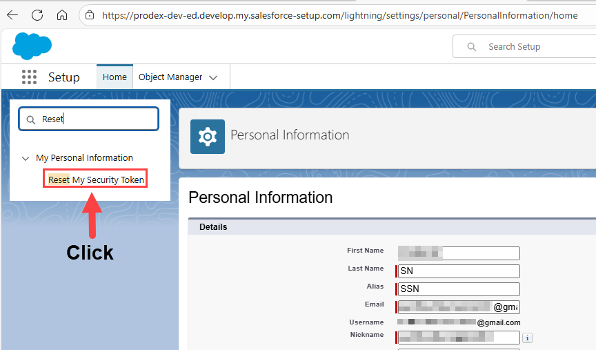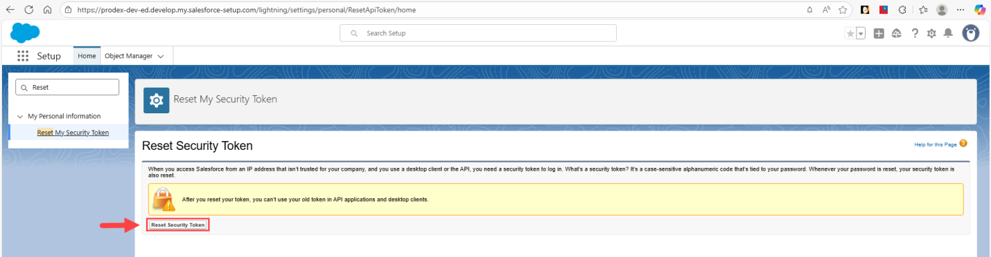 In the Quick Find search box on the left side of the screen, search for Reset My Security Token and click it.